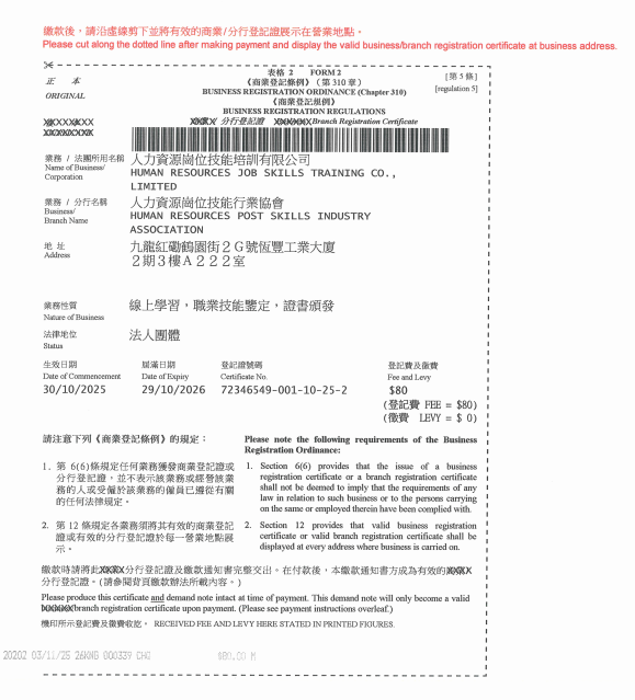 人力资源岗位技能行业协会是由特区政府批准设立,具有独立法人团体资格,团体登记注册证号72346549-001-10-25-2,英文名称( Human Resources Post Skills Industry Association),中华人民共和国司法部备案公证文书深办第51491号,法定核准业务经营范围包含“线上学习、职业技能鉴定、证书颁发”。